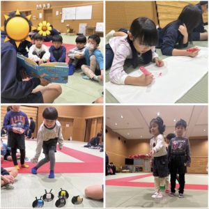 たくさんのお兄さんとお姉さんと一緒に、ボール投げや輪投げ、お絵描き等、学生さんが考えた遊びをグループごとに分かれて楽しみました。